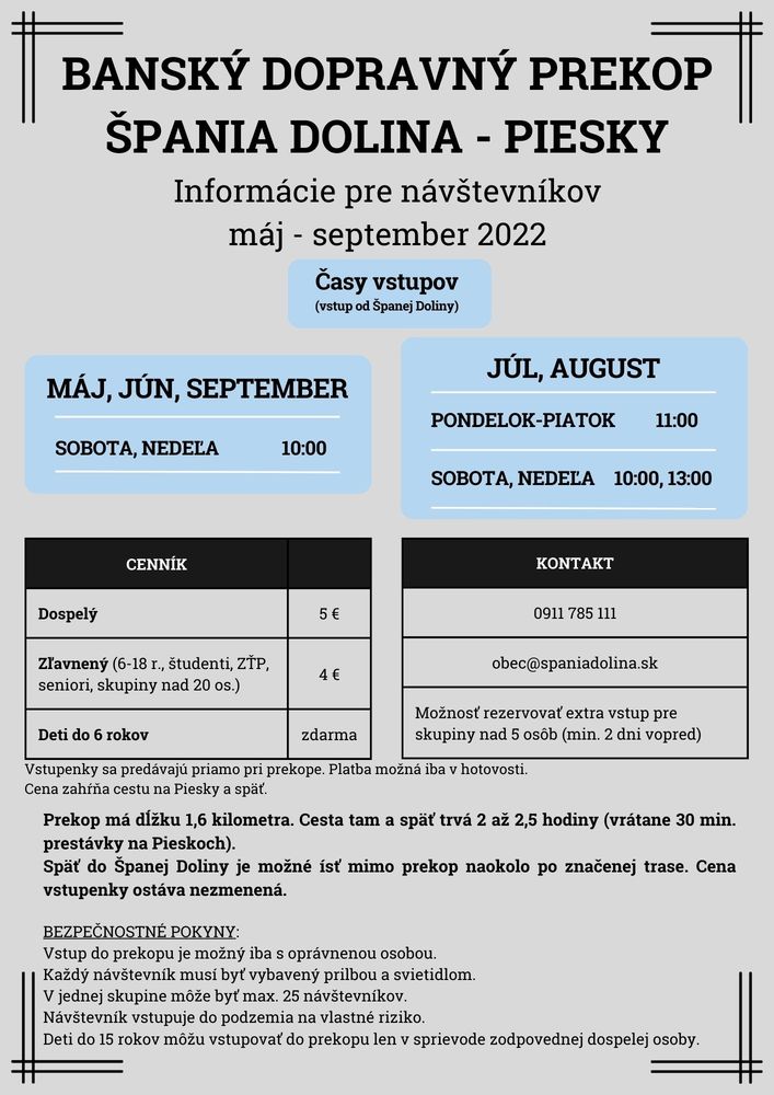 Vstup do prekopu je možný iba so sprievodcom, ktorý vám toho o prekope a o celej baníckej histórii Španej Doliny porozpráva veľa zaujímavého. Cesta tam a späť trvá približne 2 – 2,5 hodiny.
